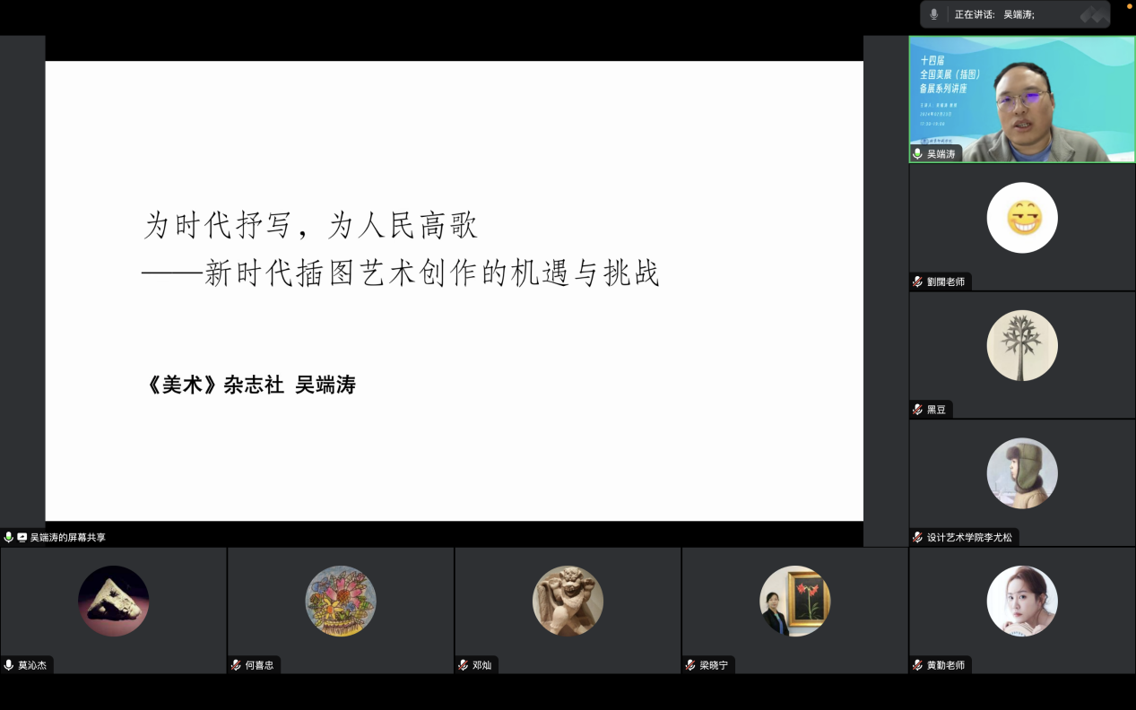 为持续做好学校第十四届全国美展的创作动员,进一步加强有组织科研工作,按照备战时间节点有序推进各艺术门类创作进度,科研处联合设计艺术学院、新媒体学院邀请校外知名专家开展讲座、进行草图汇看、观摩指导等活动。2月23日下午,《美术》杂志编辑部主任吴端涛针对美展中插图艺术创作进行线上讲座交流活动,来自插图备展的专班相关16位教师参加了交流会,会议由科研处处长助理莫沁杰主持。