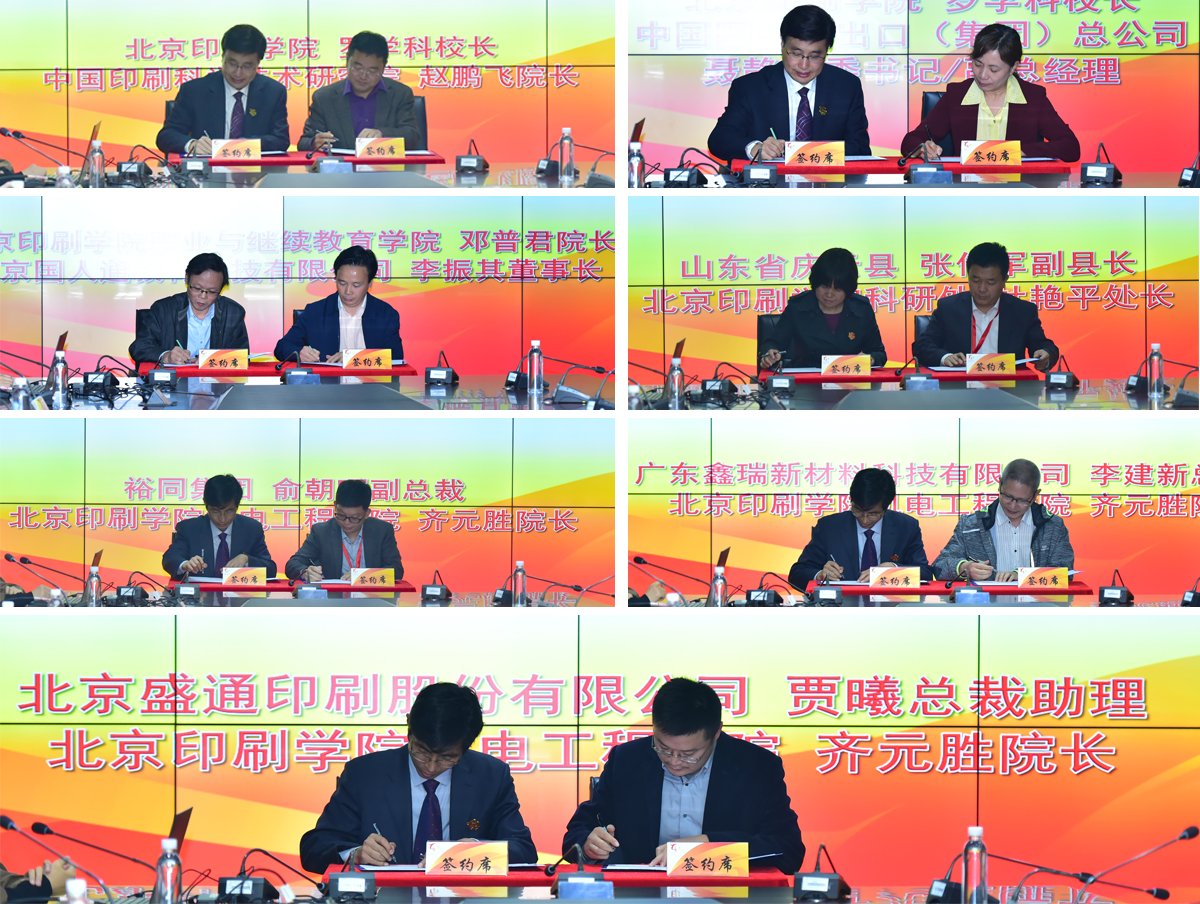 与此同时,科研处还积极推动学校与地方政府及企业的合作,在纪念活动期间与中国印刷科学技术研究院有限公司、中国图书进出口(集团)总公司和北京国人通教育科技有限公司签订了战略合作协议,并与山东省庆云县人民政府、裕同集团、广东鑫瑞新材料科技有限公司和北京盛通印刷股份有限公司就科研成果转化与落地达成协议。未来,学校将与地方、企业进一步加强在科技研发、人才培养、科技成果转化等各领域的交流与合作,共同提高双方的自主创新能力,优势互补、合作共赢,共同推动行业与产业的健康持续发展。